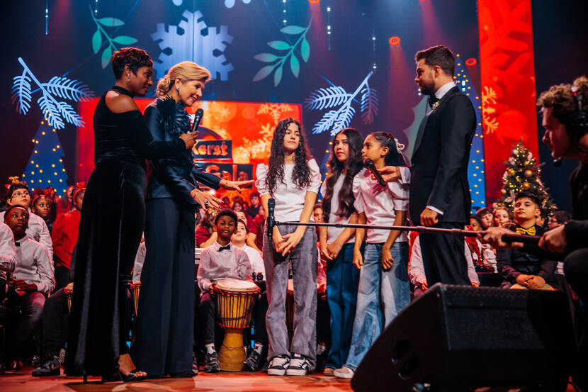Koningin Máxima is, als erevoorzitter van stichting Méér Muziek in de Klas, bij de opnames van het Kerst Muziekgala 2025. Het ...