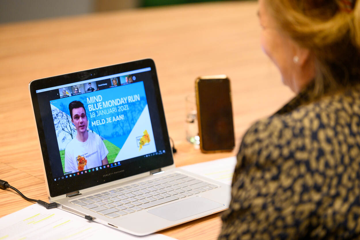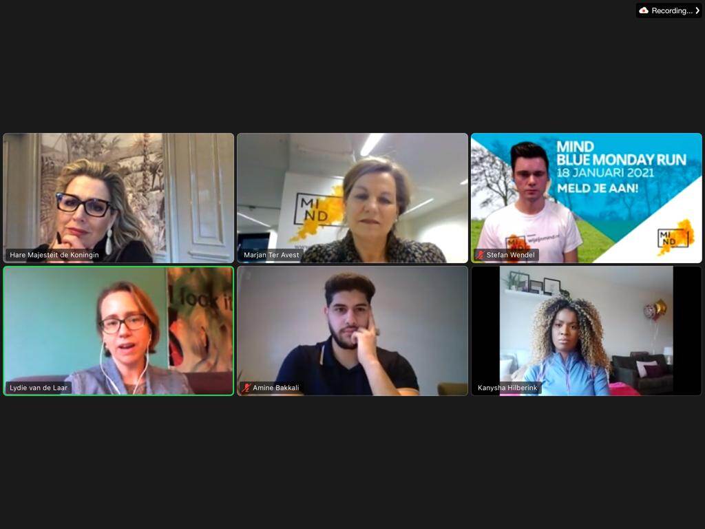 Koningin Máxima videobelt met onder anderen hulpverleners, een wetenschapper, ervaringsdeskundigen en deelnemers aan de MIND Blue Monday Run. Op ‘Blue Monday’, ieder jaar op de derde maandag van januari, besteedt MIND extra aandacht aan somberheid en depressie. Bijvoorbeeld tijdens de MIND Blue Monday Run, waarbij mensen door het hele land in beweging komen tegen depressie door te gaan wandelen of hardlopen.