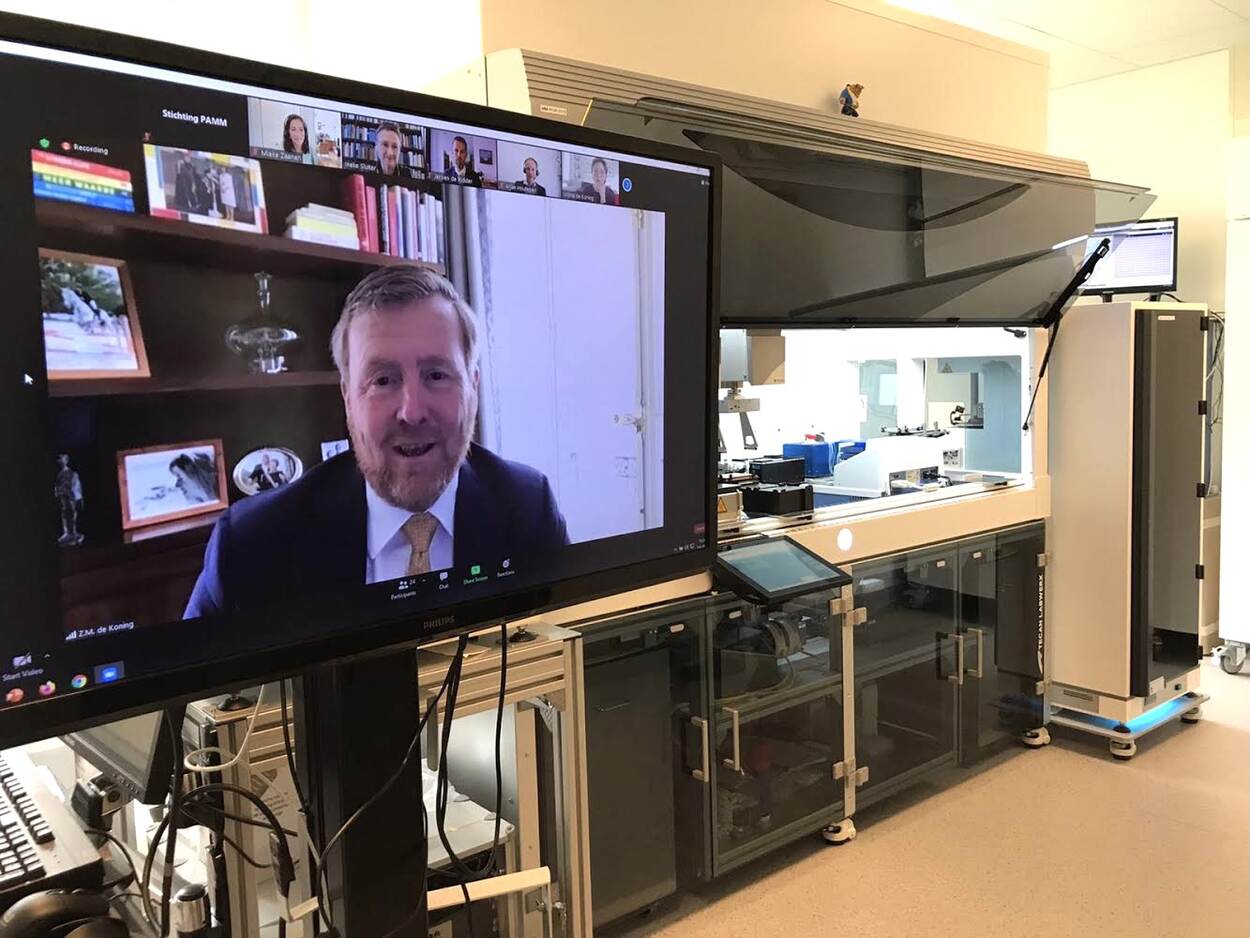 Koning Willem-Alexander brengt een digitaal werkbezoek aan de Koninklijke Nederlandse Akademie van Wetenschappen (KNAW) over de impact van de coronacrisis op de wetenschap. Veel wetenschappers hebben hun onderzoek stil moeten leggen. Tegelijkertijd ontstonden nieuwe kansen voor onderzoek en samenwerkingen, zoals de ontwikkeling van robot ‘the Beast’ die 20.000 afgenomen COVID-tests per dag kan verwerken.