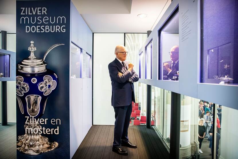 Prof. mr. Pieter van Vollenhoven bekijkt de collectie van het Zilvermuseum Doesburg.