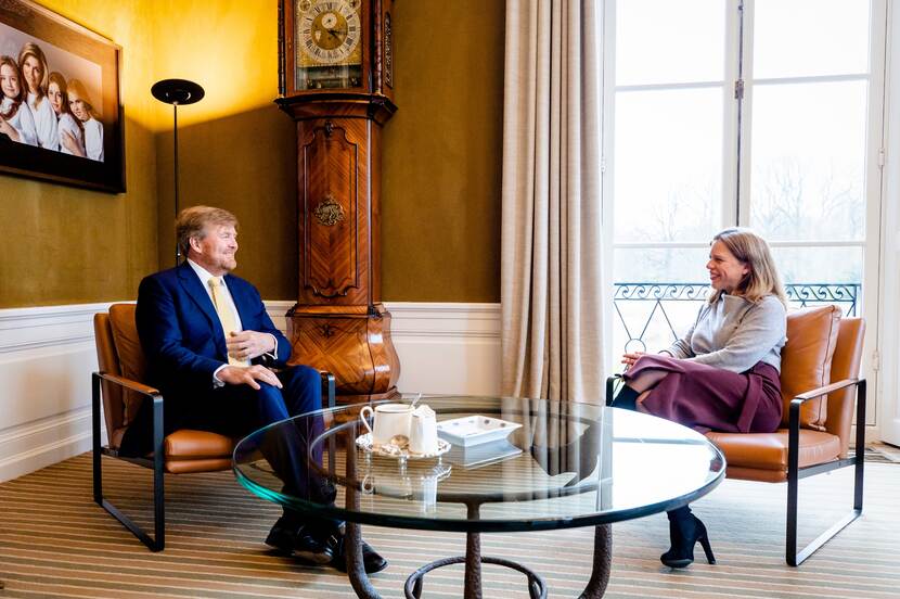 Koning Willem-Alexander ontvangt op Paleis Huis ten Bosch minister Schouten voor Armoedebeleid, Participatie en Pensioenen in het kader van een reeks van kennismakingen met de ministers en staatssecretarissen van het kabinet-Rutte IV.