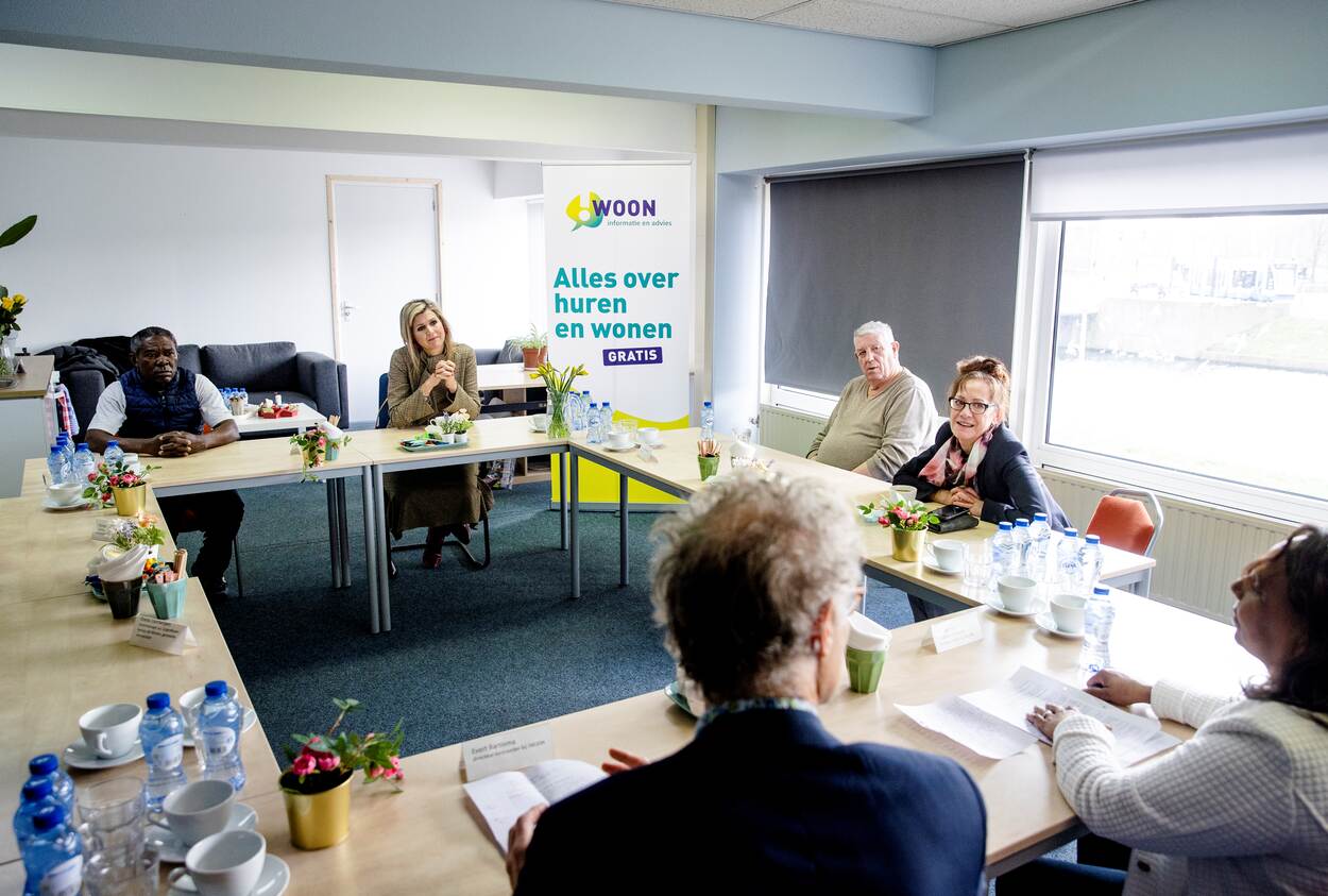 Koningin Máxima brengt een werkbezoek aan Stichting !WOON. Zij spreekt met jongere en oudere woningzoekenden in met name de huursector over de krapte op de woningmarkt.