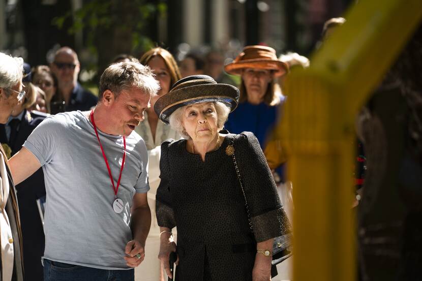Prinses Beatrix opent de beeldententoonstelling 'Voorhout Monumentaal'. De openluchttentoonstelling is georganiseerd door Pulchri Studio, een kunstenaarsvereniging en galerie voor hedendaagse kunst. Prinses Beatrix, beschermvrouwe van Pulchri Studio, neemt het eerste exemplaar van de catalogus in ontvangst en opent hiermee de expositie.