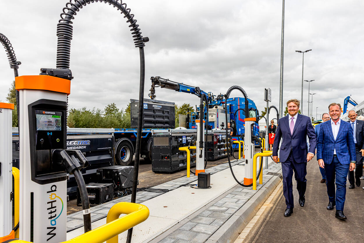 De Koning loopt over het terrein van WattHub, het eerste laadplein voor zwaar bouwmaterieel en elektrische vrachtwagens.