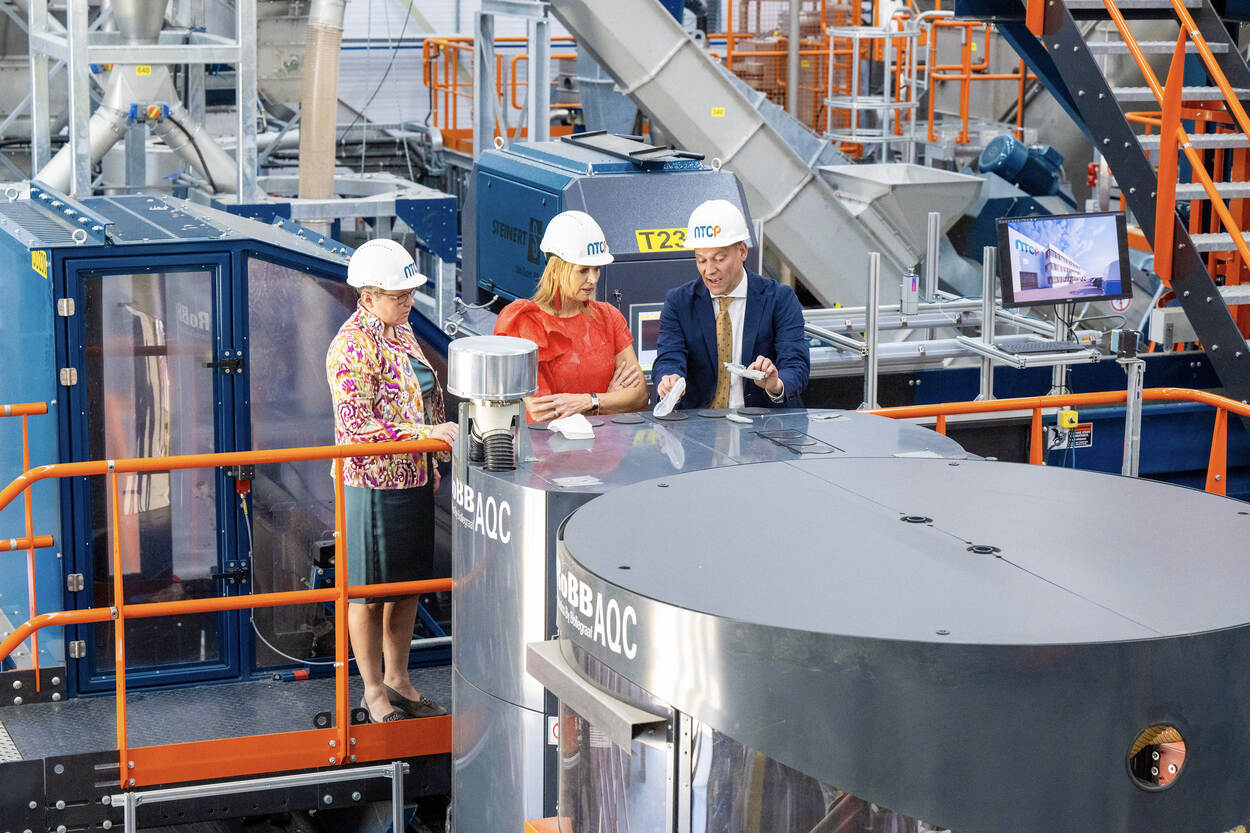 Koningin Máxima krijgt een rondleiding door het Nationaal Testcentrum Circulaire Plastics. Zij krijgt praktijkvoorbeelden te zien van het hergebruiken van regionale grondstoffen die door samenwerking met verschillende partijen tot stand zijn gekomen.