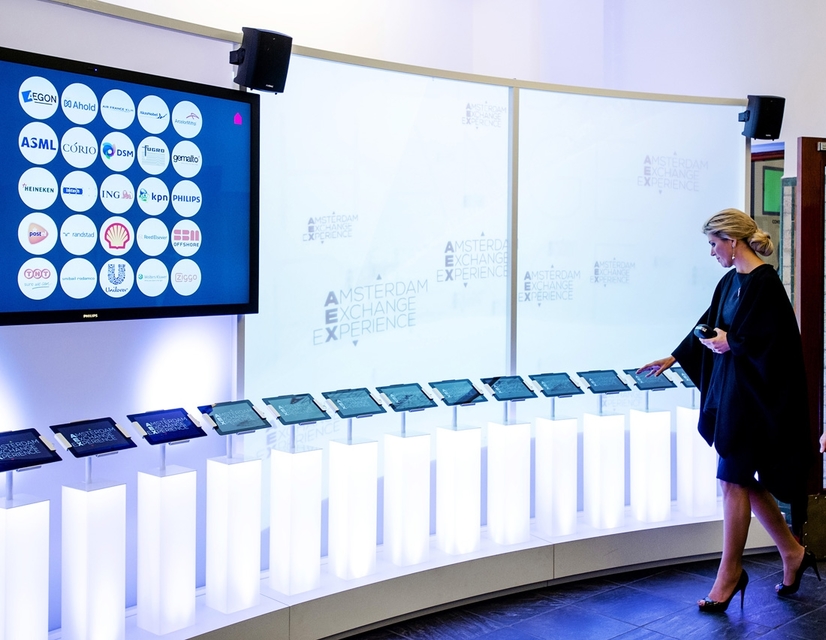 Koningin Máxima bezoekt in het beursgebouw de Amsterdam Exchange Experience, een interactieve expositie over het functioneren van de beurs en beursgenoteerde ondernemingen.