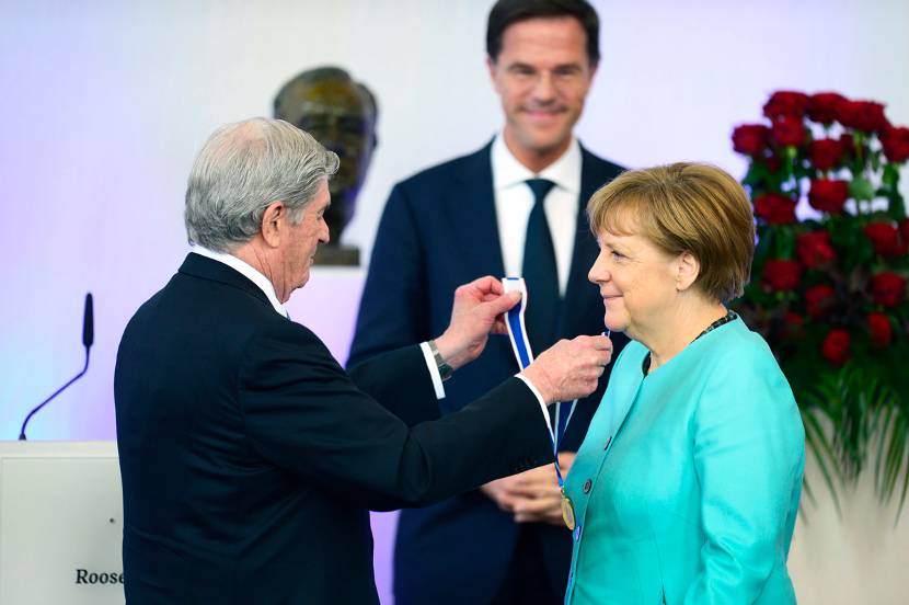 De International Four Freedoms Award wordt uitgereikt aan dr. Angela Merkel. Zij heeft een cruciale rol gespeeld in de aanpak van de financiële crisis in de Europese Unie. Als Europees leider leidde zij de onderhandelingen voor een diplomatieke oplossing en de-escalatie van het conflict in Oekraïne (vredesbesprekingen Minsk en overeenkomst van Minsk) in het belang van vrede en veiligheid in Europa. Ze toont groot moreel leiderschap als Bondskanselier van alle Duitsers ongeacht geloof en etnische achtergrond tegenover de opkomst van de anti Islam beweging Pegida in 2014. In de huidige vluchtelingencrisis is Merkel toegewijd aan de humanitaire plicht van Europa om diegenen op te vangen die op de vlucht zijn voor oorlog en conflict in het Midden-Oosten, Afrika en Azië en aan de aanpak van de oorzaken van deze crisis door zich in te zetten voor vrede in Syrië en in de regio.