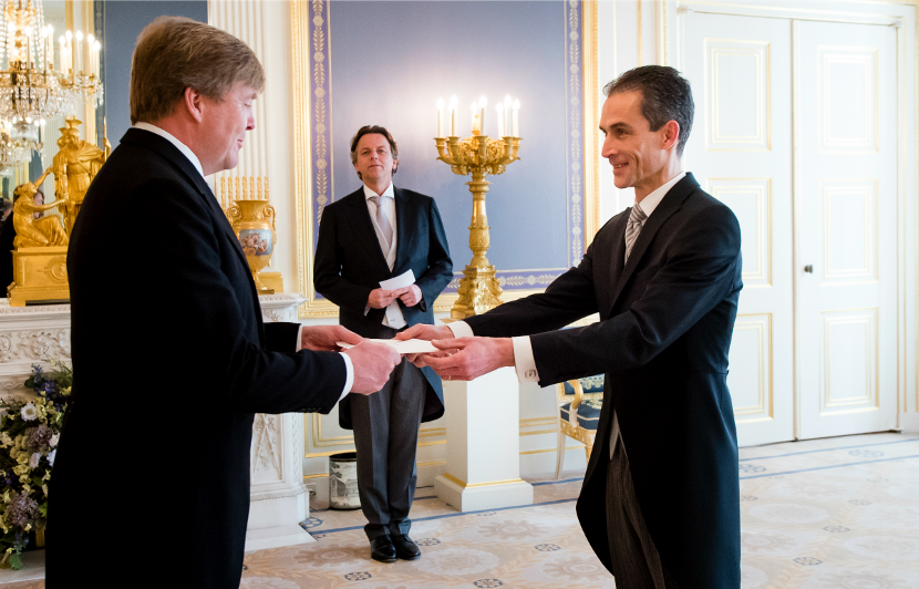 Bij Paleis Noordeinde staan een erewacht en een militaire kapel opgesteld. De erewacht bestaat uit een commandant en twee detachementen van 11 Luchtmobiele Brigade. De muziek wordt verzorgd door de Koninklijke Militaire Kapel Johan Willem Friso. Bij de ingang van het Paleis staan twee ereposten van de Koninklijke Marechaussee Brigade Den Haag. Na een eresaluut van vier roffels en het volkslied van het land van de ambassadeur volgt een inspectie van de erewacht, waarna de ambassadeur met gevolg binnentreedt. Bij het vertrek van de ambassadeur krijgt deze opnieuw vier ereroffels.