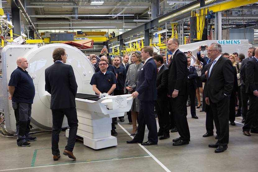 De tweede dag van het werkbezoek begint met een bezoek aan Siemens Healthcare in Erlangen. In de regio zijn zo’n 180 bedrijven actief in de medische technologie, die zich met name richten op röntgentechnologie, e-health en rehabilitatie. Het Duitse Siemens is wereldwijd een belangrijke speler in deze sector en een interessante partner voor Nederlandse toeleveranciers. Het Koninklijk Paar bezoekt de productiehal van Siemens, waar medische scanapparatuur (MRI) wordt geproduceerd.