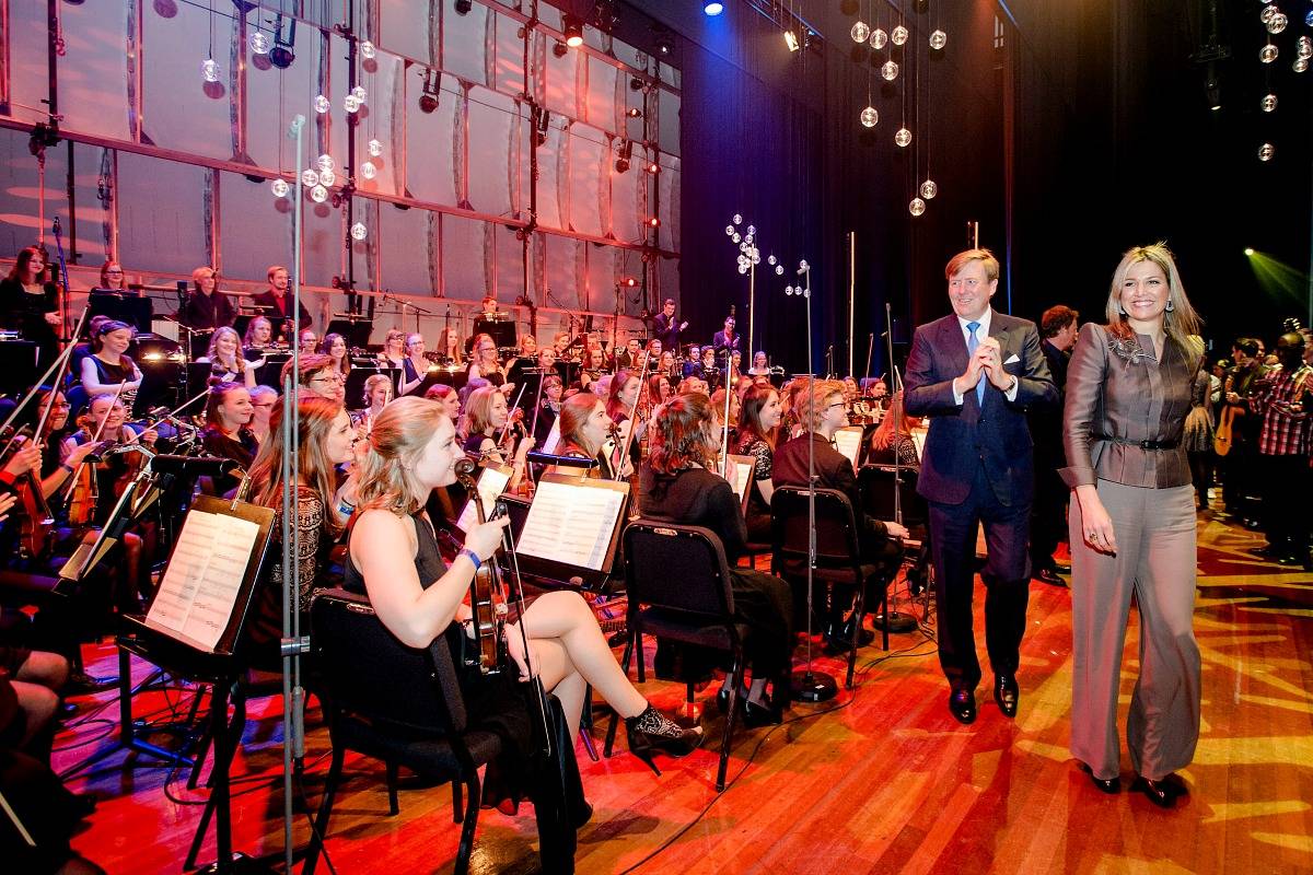 Zijne Majesteit Koning Willem-Alexander, Hare Majesteit Koningin Máxima en Hare Koninklijke Hoogheid Prinses Beatrix zijn maandagavond 18 april 2016 aanwezig bij het Koningsdagconcert in theater De Spiegel in Zwolle.
