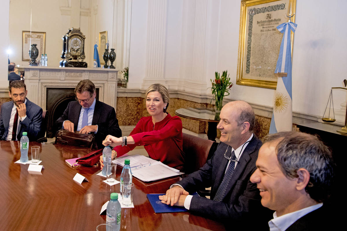 Koningin Máxima heeft onder andere besprekingen met de lokale coördinator van de Verenigde Naties, de minister van Buitenlandse Zaken, mevrouw Susana Malcorra en de minister van Financiën, Alfonso Prat-Gay. Ook spreekt zij de gouverneur van de centrale bank, Federico Sturzenegger. Koningin Máxima neemt verder deel aan een rondetafelgesprek met vertegenwoordigers van overheids-instellingen over hun rol in de plannen voor inclusieve financiering. In dit kader spreekt zij ook met vertegenwoordigers van financiële organisaties en andere private instellingen. Goede samenwerking tussen de publieke en private sector is nodig voor een succesvolle uitvoering van de nationale strategie.