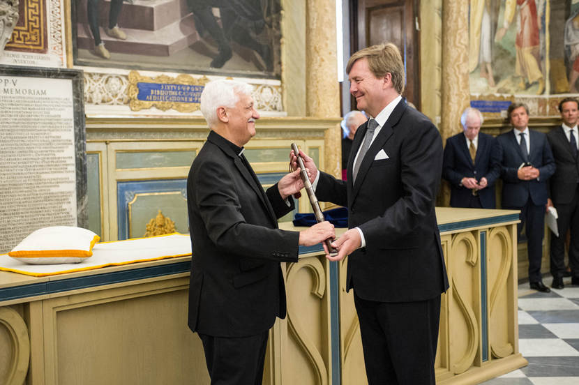 Na afloop krijgt de Koning in de Biblioteca Apostolica een aan Willem van Oranje toegeschreven bevelhebbersstaf overhandigd. De katholieke Spanjaarden bemachtigden deze bevelhebbersstaf na hun overwinning op protestantse Nederlandse opstandelingen bij de slag op de Mookerheide (1574). Deze baton wordt in bruikleen gegeven door het Catalaanse Jezuïeten convent Sant Cugat en draagt het wapen van Willem van Oranje. Van april tot en met oktober 2018 is de staf te bezichtigen in het Nationaal Militair Museum in Soesterberg, tijdens een expositie over Willem van Oranje.