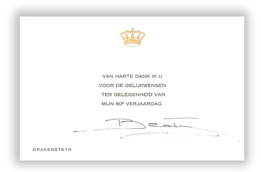 Bedankkaart van Prinses Beatrix ter gelegenheid van de gelukwensen voor haar 80ste verjaardag.
