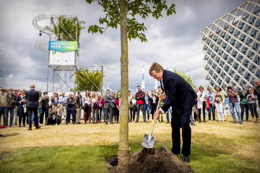 WUR organiseert in het jubileumjaar diverse wetenschappelijke congressen, seminars en andere activiteiten rond het thema ‘Wisdom and Wonder’. Op 23 juni komen op circa honderd plaatsen over de wereld alumni samen om een World Wide Dialogue te voeren. Alumni gaan online met elkaar in gesprek over de vraag hoe megasteden in de nabije toekomst gevoed kunnen worden. De Koning geeft hiervoor het startsein. Vervolgens bekijkt de Koning demonstraties van moderne ideeën voor waterzuivering, precisielandbouw en nieuwe veredelingstechnieken. Daarna plant hij een van de honderd bomen die dit jaar ter ere van het honderdjarig bestaan wereldwijd een bos van ‘UniversiTrees’ moeten vormen. De bomen markeren zo de wereldwijde verbinding met Wageningen.