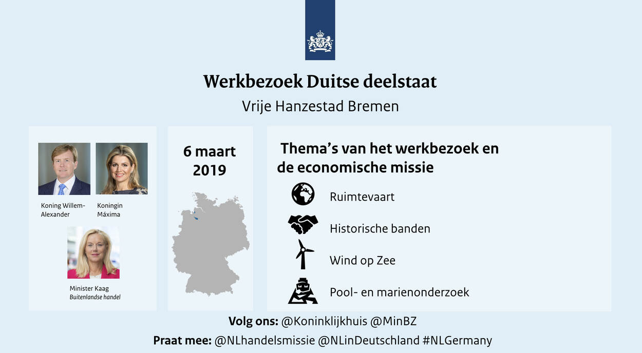 Zijne Majesteit Koning Willem-Alexander en Hare Majesteit Koningin Máxima brengen woensdag 6 maart 2019 een werkbezoek aan de Vrije Hanzestad Bremen. Zij worden bij hun bezoek aan de Duitse deelstaat vergezeld door minister Sigrid Kaag voor Buitenlandse Handel en Ontwikkelingssamenwerking. Minister Kaag leidt gelijktijdig een economische missie op de terreinen ruimtevaart en windenergie op zee.