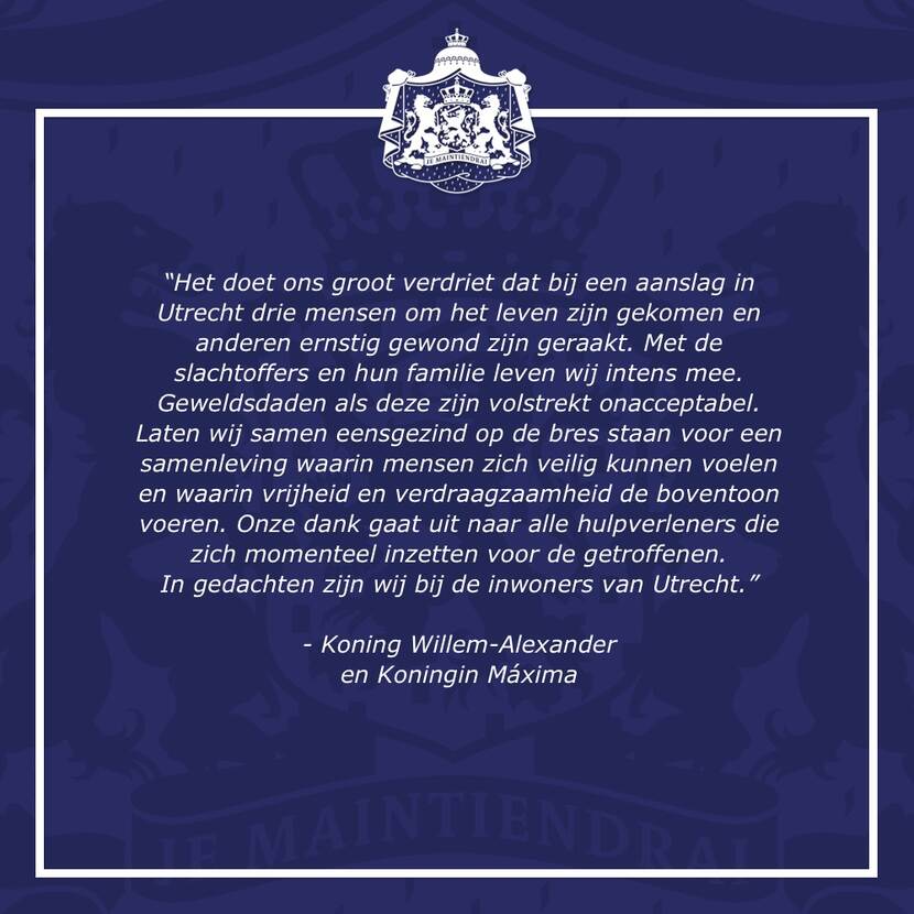 "Het doet ons groot verdriet dat bij een aanslag in Utrecht drie mensen om het leven zijn gekomen en anderen ernstig gewond zijn geraakt. Met de slachtoffers en hun familie leven wij intens mee. Geweldsdaden als deze zijn volstrekt onacceptabel. Laten wij samen eensgezind op de bres staan voor een samenleving waarin mensen zich veilig kunnen voelen en waarin vrijheid en verdraagzaamheid de boventoon voeren. Onze dank gaat uit naar alle hulpverleners die zich momenteel inzetten voor de getroffenen. In gedachten zijn wij bij de inwoners van Utrecht."