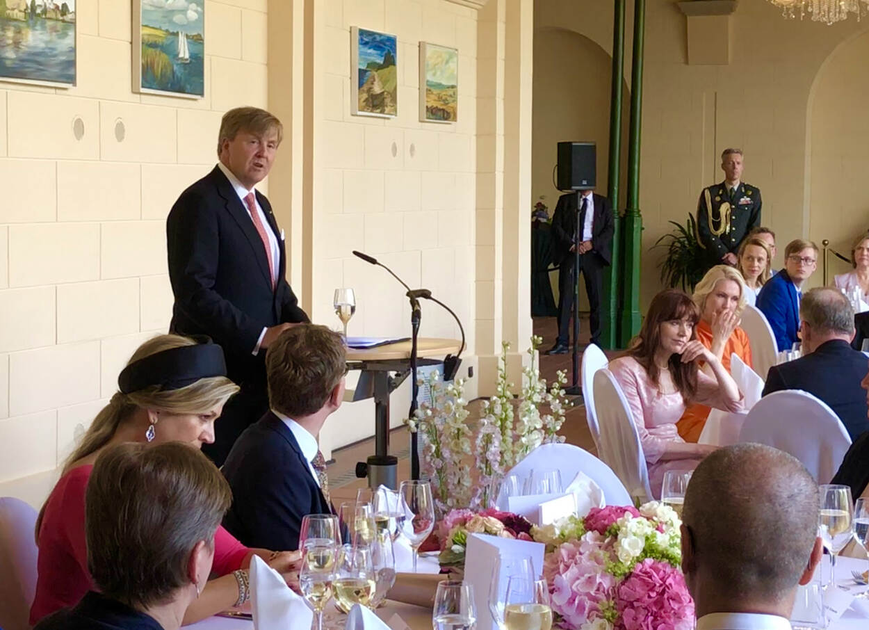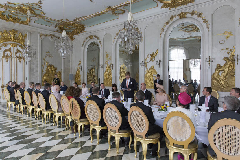 Koning Willem-Alexander houdt een toespraak tijdens de lunch in Schloss Schwerin.