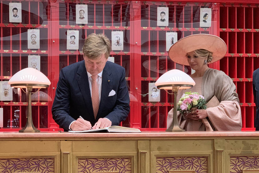 Koning Willem-Alexander en Koningin Máxima ondertekenen het gastenboek van studio Babelsberg in de hotellobby uit de film ‘The Grand Budapest Hotel’.