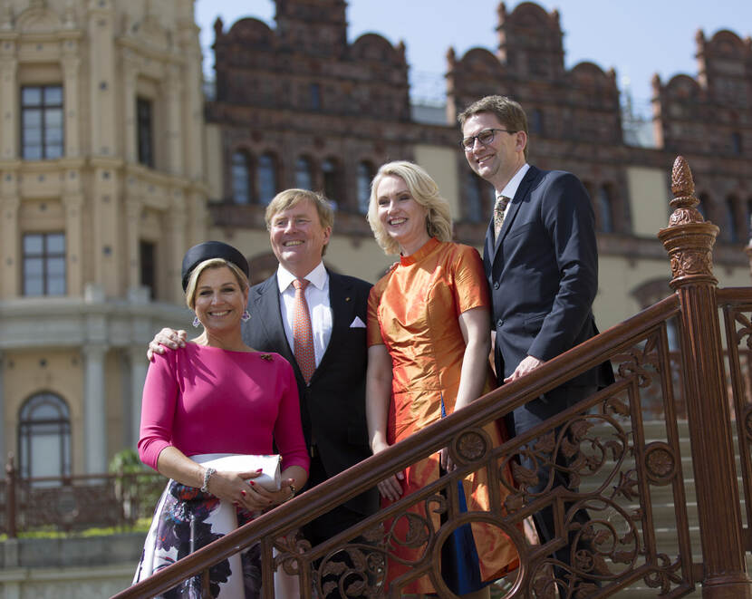 Het Koninklijk Paar en de minister-president van Mecklenburg-Voor-Pommeren met achter hen het historische Schloss Schwerin, het symbool van de stad Schwerin en de Duitse deelstaat.