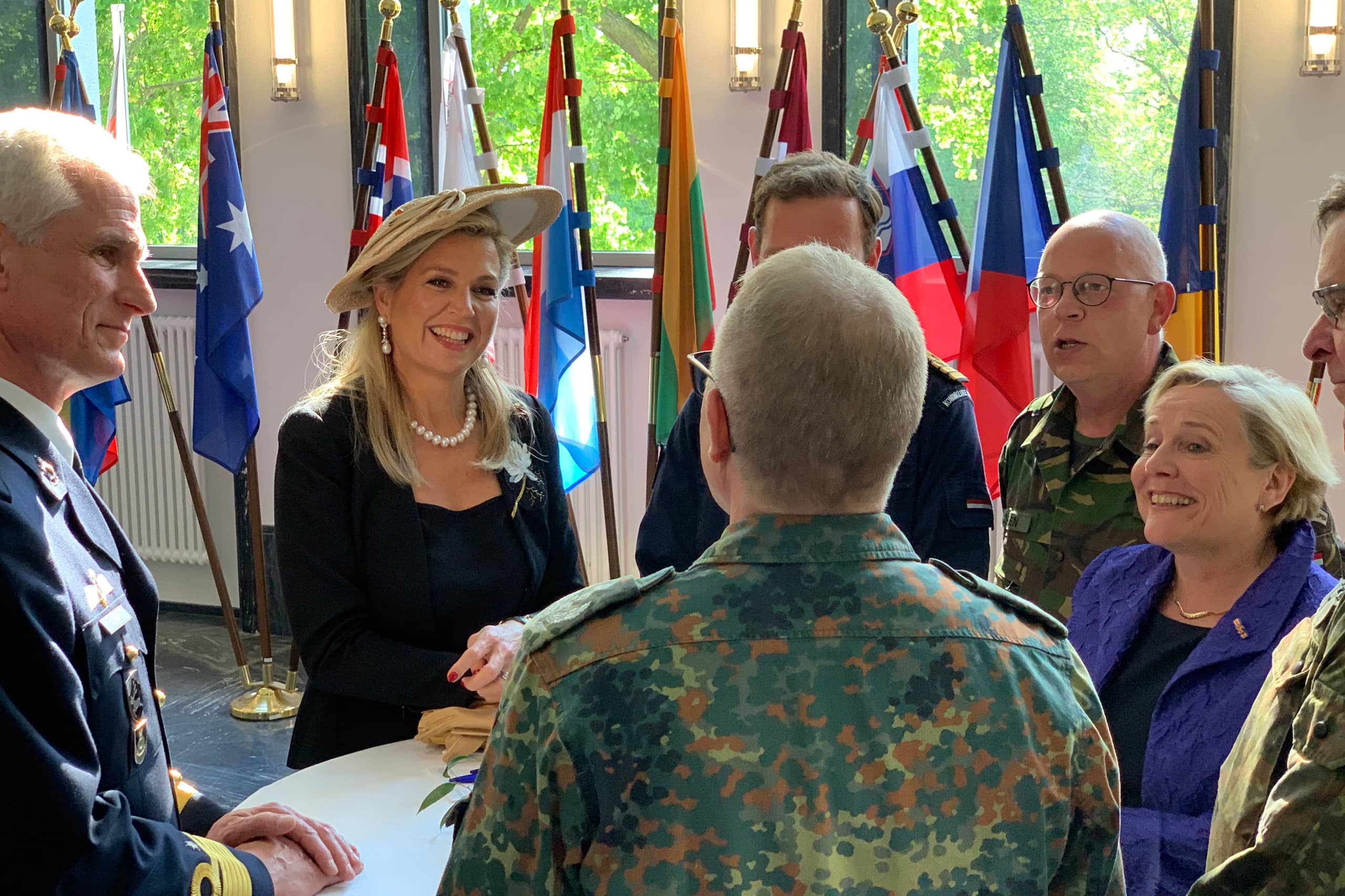 Koningin Máxima spreekt met Nederlandse en Duitse militairen over hun samenwerking in missiegebieden en de ondersteuning die het thuisfront krijgt voorafgaand en tijdens de missie.
