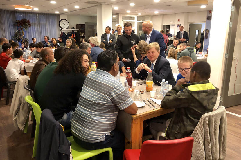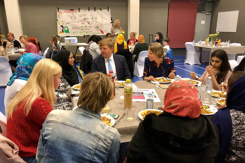 Koning bij Iftar-ontmoeting in buurthuis Mandelaplein in Den Haag