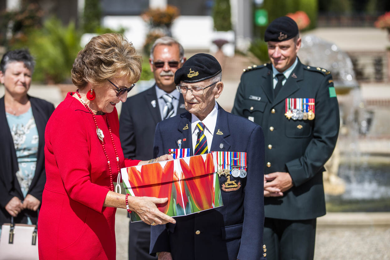 Prinses Margriet overhandigt ‘Liberation75’ tulpenbollen aan Canadese Veteraan Don White