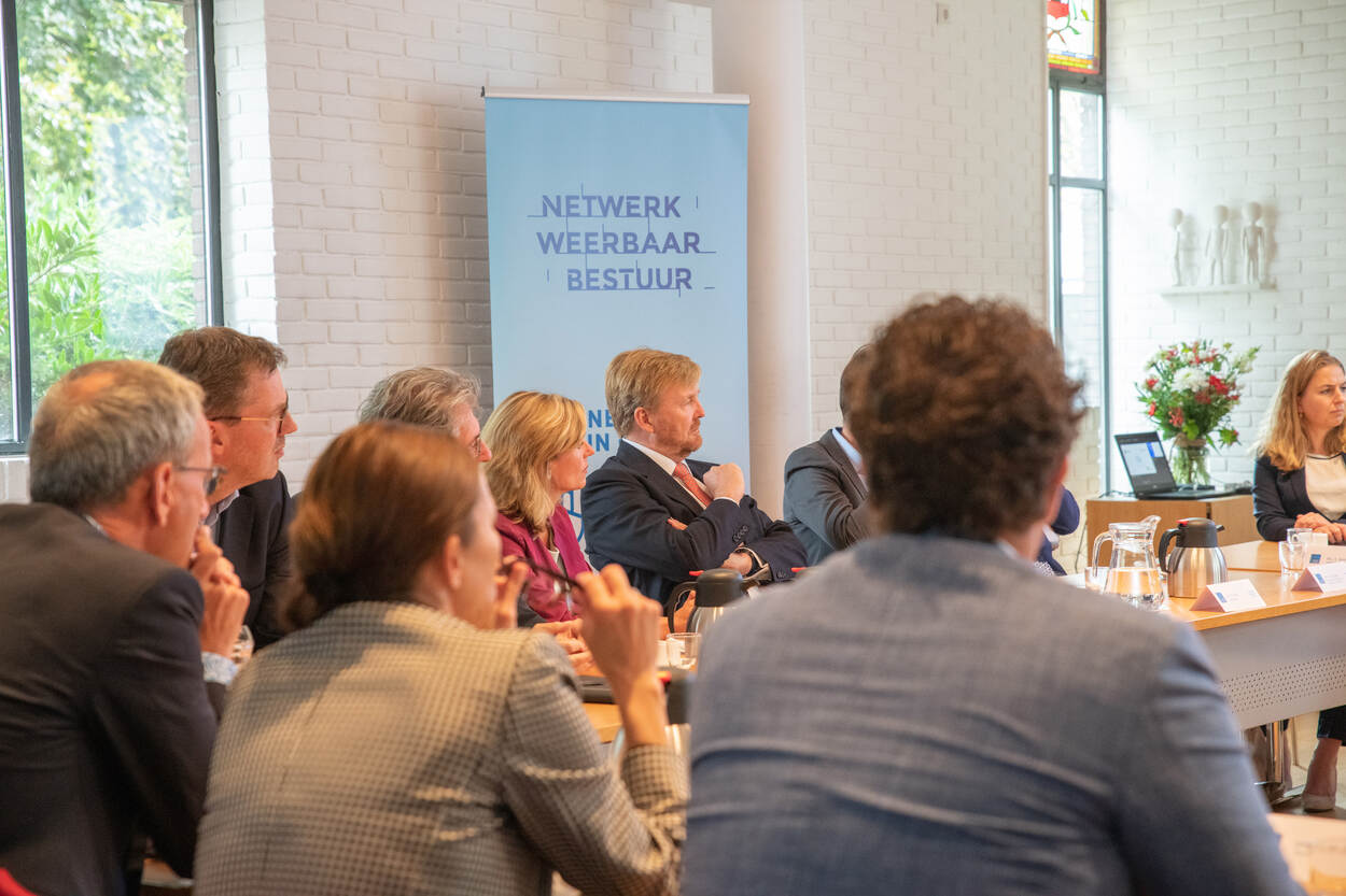 Het netwerk biedt onder andere het Ondersteuningsteam Weerbaar Bestuur aan, dat bestaat uit vertrouwenspersonen, experts en ervaringsdeskundigen. Zij geven politieke ambtsdragers, bestuurders en hun gezinnen die te maken hebben met agressie of ondermijning een steun in de rug en bieden een luisterend oor en persoonlijk advies. Vandaag kwam het Ondersteuningsteam in aanwezigheid van de Koning voor de tweede keer bijeen. De Koning sprak met deze groep over hoe zij zich mentaal en fysiek kunnen weren en hoe zij elkaar kunnen helpen, onder meer door het bespreekbaar maken van morele dilemma’s. Aan bod kwamen ook voorbeelden van instrumenten om weerbaarheid en veiligheid te vergroten. Zo laten steeds meer burgemeesters en wethouders woningscans uitvoeren door het Centrum voor Criminaliteitspreventie en Veiligheid en biedt het Opleidingsinstituut van de Dienst Justitiële Inrichtingen (DJI) de training ‘Omgaan met intimidatie en bedreiging’ aan. De Koning kreeg uitleg over de werking van de scans en de trainingen en sprak met bestuurders over hun ervaringen. Ook werd gesproken over de inspanningen om de weerbaarheid van partners en kinderen van politieke ambtsdragers te vergroten.