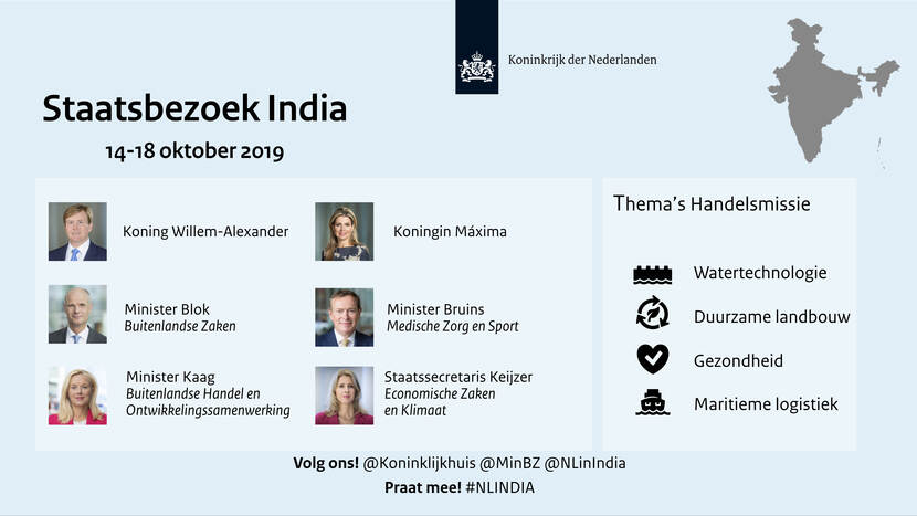 Zijne Majesteit Koning Willem-Alexander en Hare Majesteit Koningin Máxima brengen op uitnodiging van president Ram Nath Kovind een staatsbezoek aan de Republiek India. Het bezoek vindt plaats van 14 tot en met 18 oktober. Het Koninklijk Paar bezoekt de steden New Delhi, Mumbai en de staat Kerala.