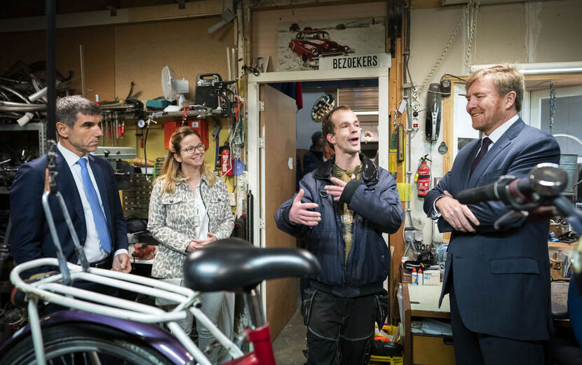 Bij het ZRC spraken de Koning en de staatssecretaris met lokale betrokkenen over hoe de regio Venlo/Weert tot deze vorm van opvang is gekomen en wat de uitdagingen zijn om dit goed te organiseren.  Vervolgens bezochten zij in de loods van het centrum onder andere de fietsenwerkplaats en kledingwinkel. Daar spraken zij met medewerkers over de dagelijkse gang van zaken in het ZRC.