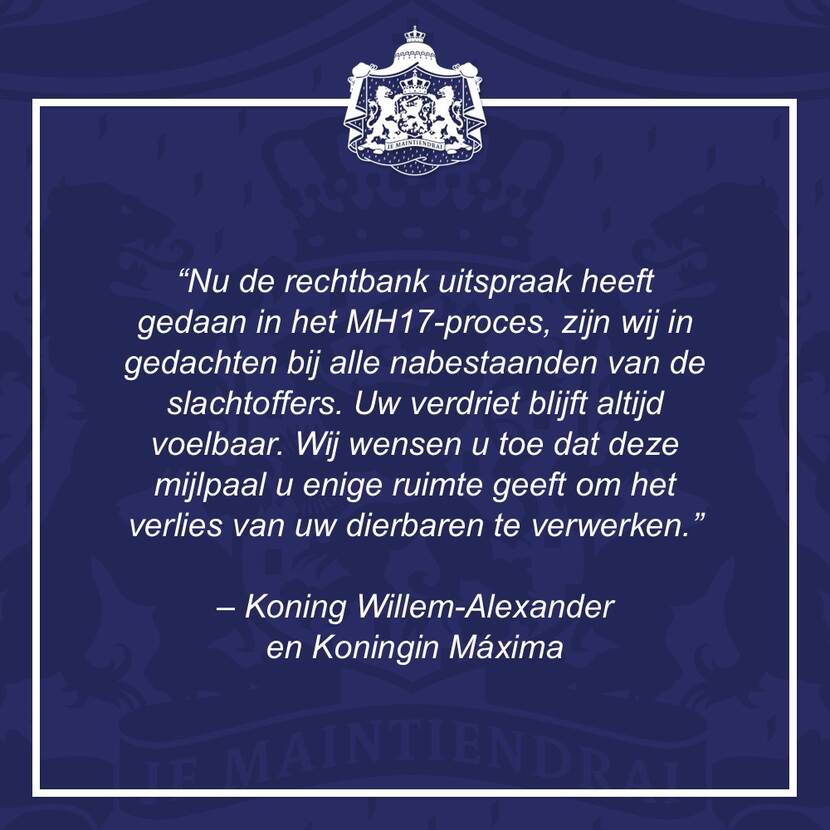 “Nu de rechtbank uitspraak heeft gedaan in het MH17-proces, zijn wij in gedachten bij alle nabestaanden van de slachtoffers. Uw verdriet blijft altijd voelbaar. Wij wensen u toe dat deze mijlpaal u enige ruimte geeft om het verlies van uw dierbaren te verwerken.”
