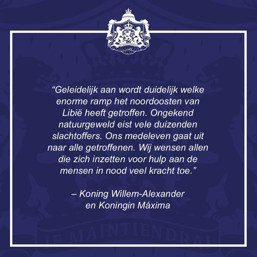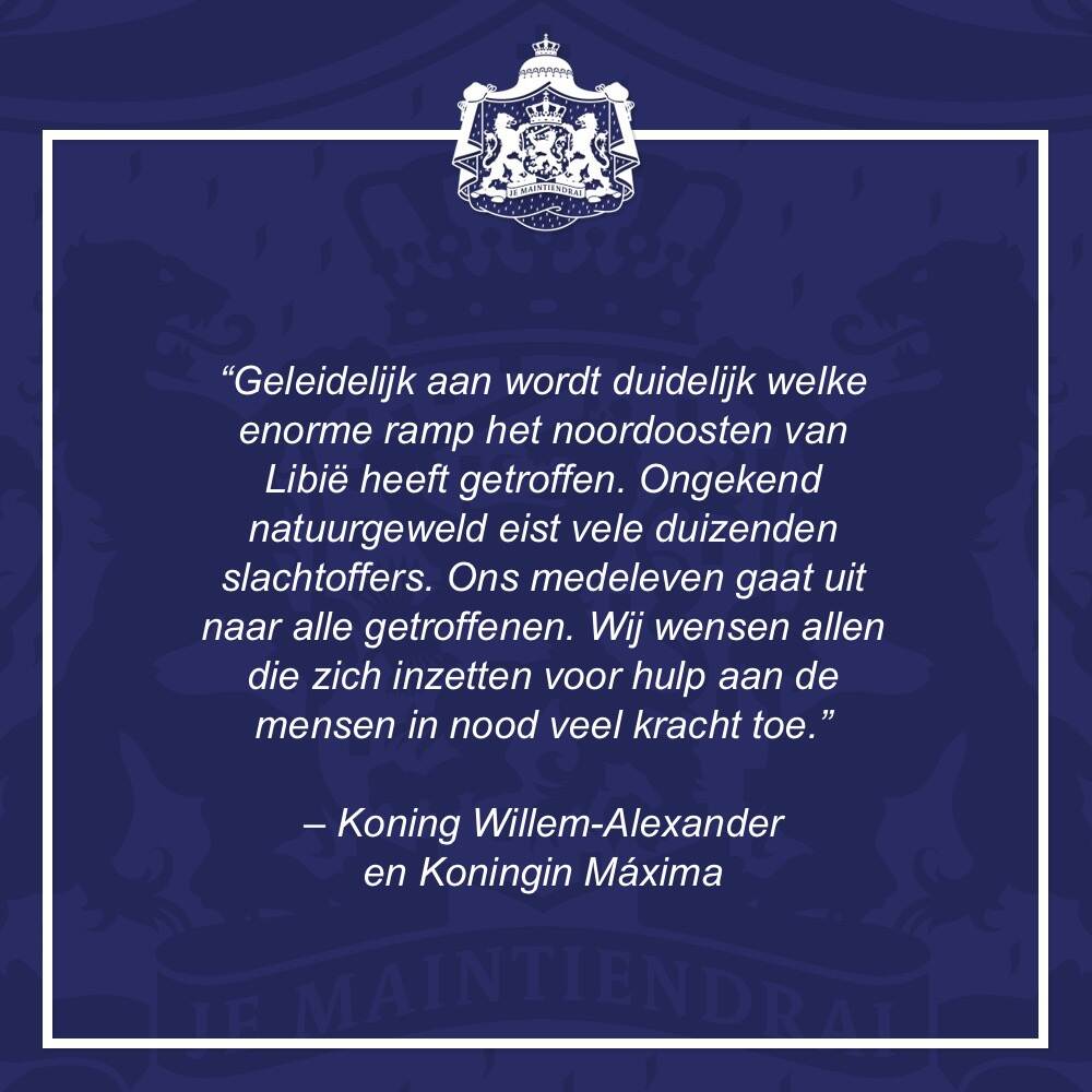 "Geleidelijk aan wordt duidelijk welke enorme ramp het noordoosten van Libië heeft getroffen. Ongekend natuurgeweld eist vele duizenden slachtoffers. Ons medeleven gaat uit naar alle getroffenen. Wij wensen allen die zich inzetten voor hulp aan de mensen in nood veel kracht toe."