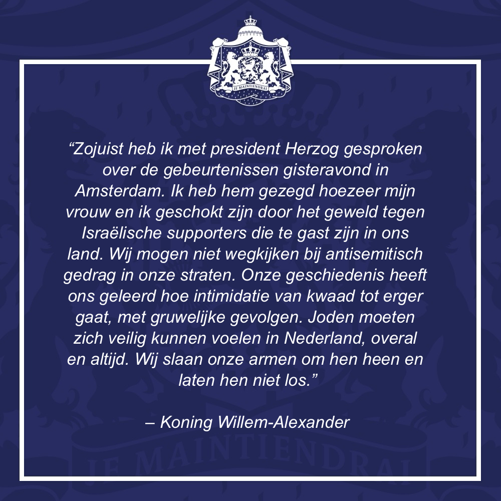 “Zojuist heb ik met president Herzog gesproken over de gebeurtenissen gisteravond in Amsterdam. Ik heb hem gezegd hoezeer mijn vrouw en ik geschokt zijn door het geweld tegen Israëlische supporters die te gast zijn in ons land. Wij mogen niet wegkijken bij antisemitisch gedrag in onze straten. Onze geschiedenis heeft ons geleerd hoe intimidatie van kwaad tot erger gaat, met gruwelijke gevolgen. Joden moeten zich veilig kunnen voelen in Nederland, overal en altijd. Wij slaan onze armen om hen heen en laten hen niet los.” – Koning Willem-Alexander