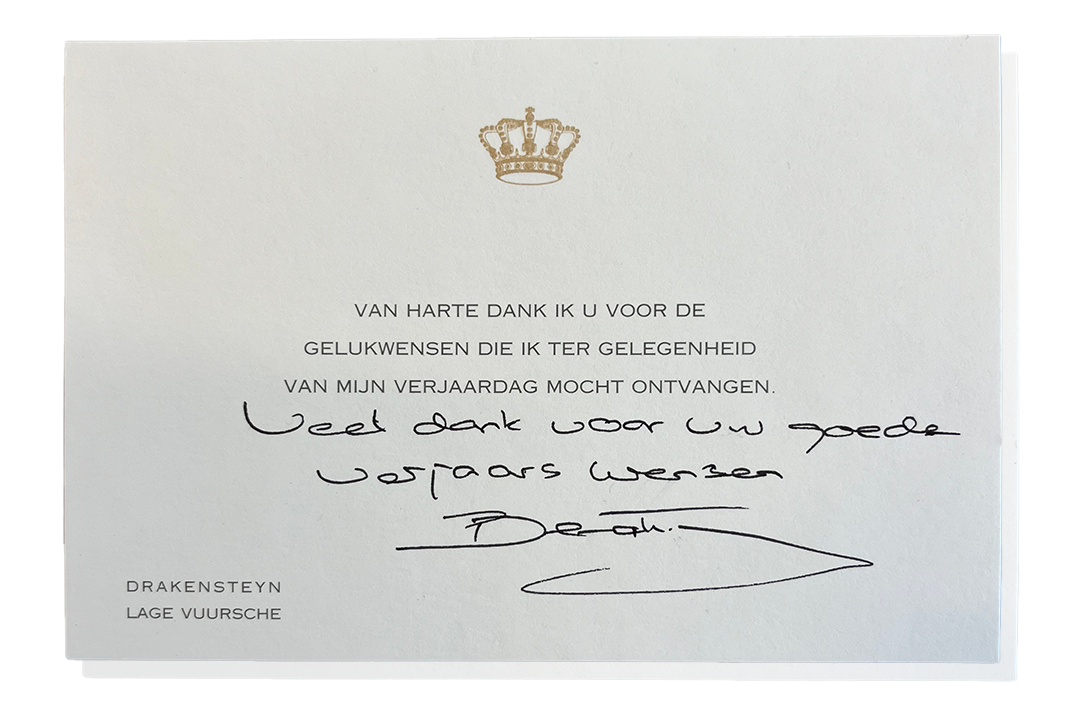 Bedankkaart van Prinses Beatrix ter gelegenheid van de gelukwensen die zij ontving voor haar 87ste verjaardag.