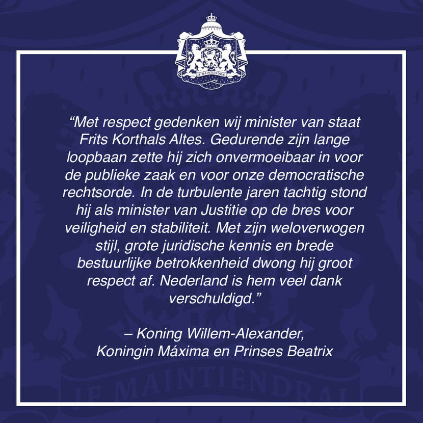 "Met respect gedenken wij minister van staat Frits Korthals Altes. Gedurende zijn lange loopbaan zette hij zich onvermoeibaar in voor de publieke zaak en voor onze democratische rechtsorde. In de turbulente jaren tachtig stond hij als minister van Justitie op de bres voor veiligheid en stabiliteit. Met zijn weloverwogen stijl, grote juridische kennis en brede bestuurlijke betrokkenheid dwong hij groot respect af. Nederland is hem veel dank verschuldigd."