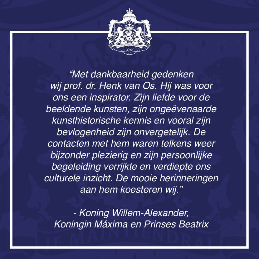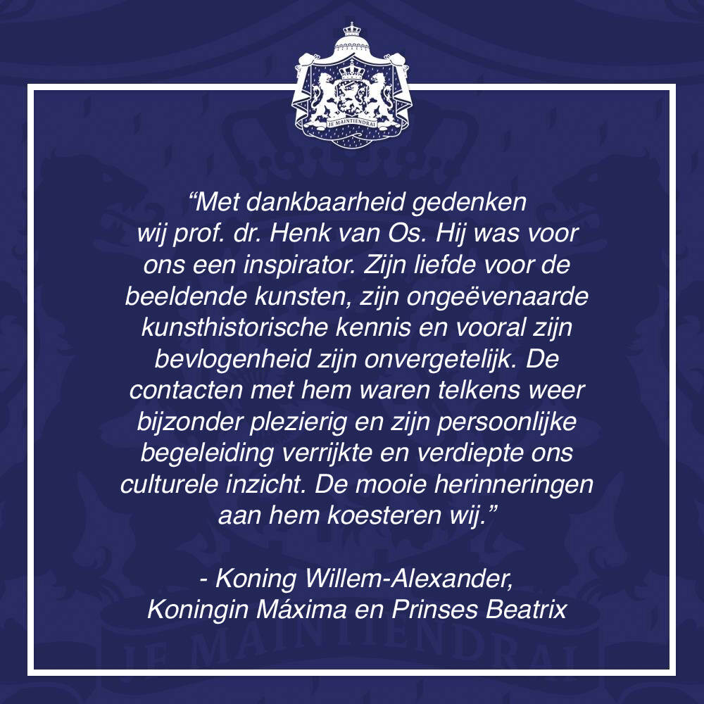 “Met dankbaarheid gedenken wij prof. dr. Henk van Os. Hij was voor ons een inspirator. Zijn liefde voor de beeldende kunsten, zijn ongeëvenaarde kunsthistorische kennis en vooral zijn bevlogenheid zijn onvergetelijk. De contacten met hem waren telkens weer bijzonder plezierig en zijn persoonlijke begeleiding verrijkte en verdiepte ons culturele inzicht. De mooie herinneringen aan hem koesteren wij.”