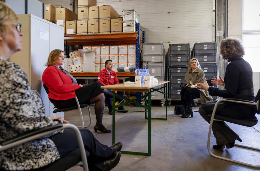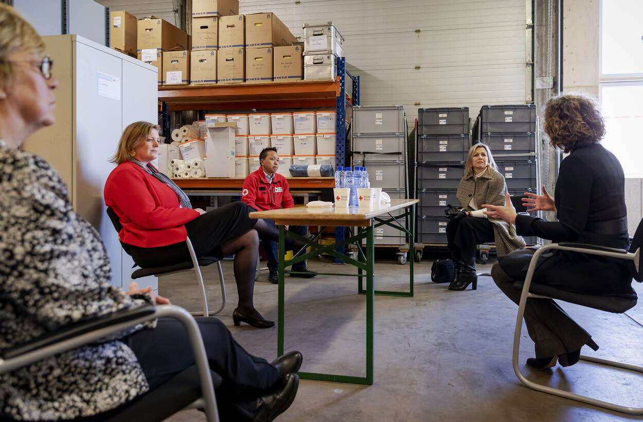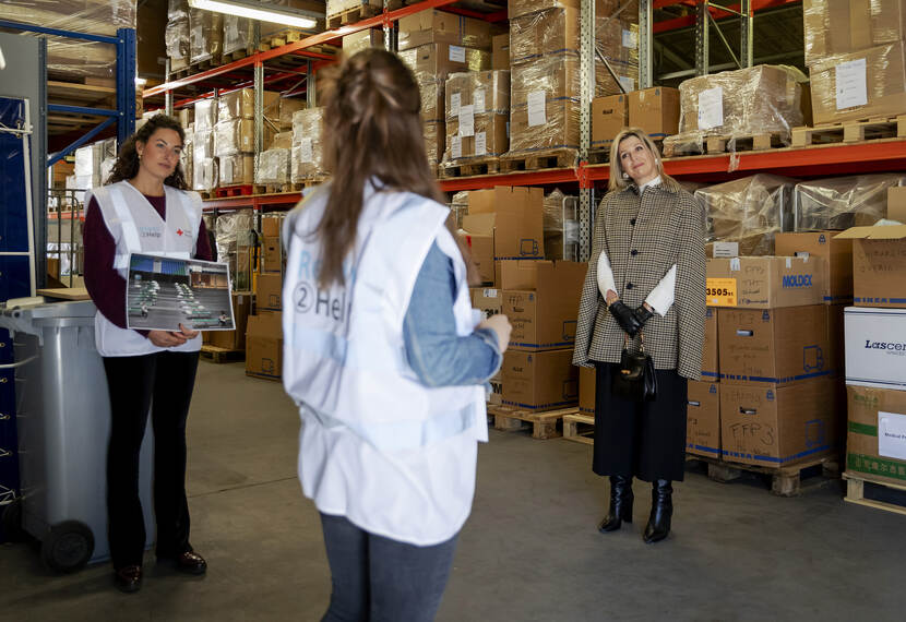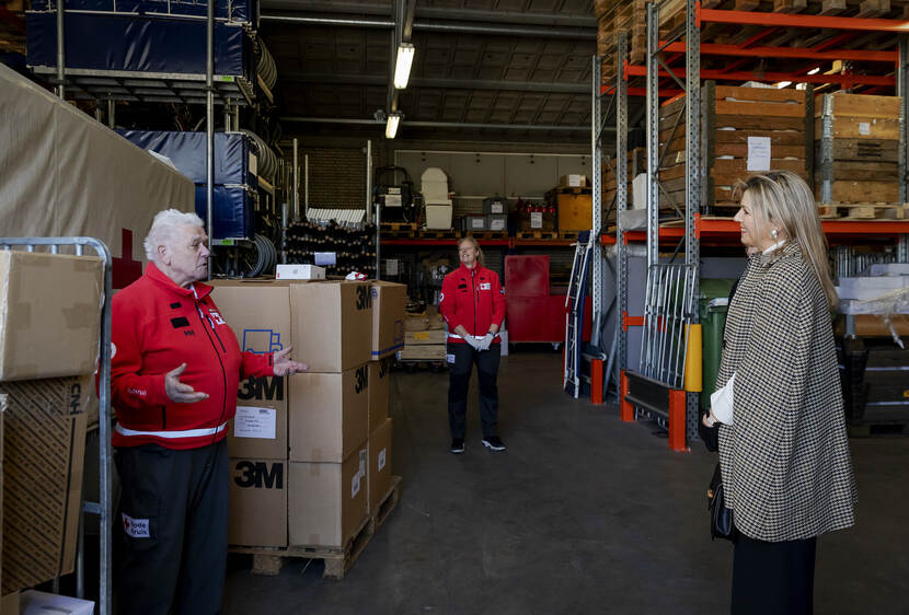 Koningin Máxima bezoekt vrijwilligers van het Rode Kruis in Loenen. Het werkbezoek vindt plaats in het kader van de uitbraak van het coronavirus (COVID-19). Tijdens een rondleiding spreekt de Koningin o.a. met vrijwilligers die zich inzetten voor ouderen en kwetsbare mensen, die beschermingsmiddelen en medische hulpmiddelen inzamelen en die zorginstellingen helpen.