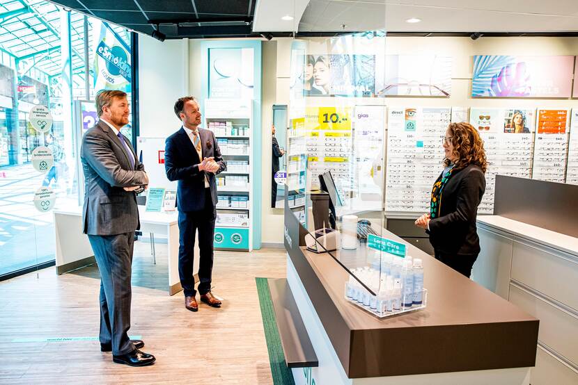 De Koning brengt een werkbezoek aan ondernemers met contactberoepen in een winkelcentrum in Stein in Limburg, in het kader van het coronavirus (COVID-19). Hij bezoekt een kapper, opticien, nagelstudio en fysiotherapeut.