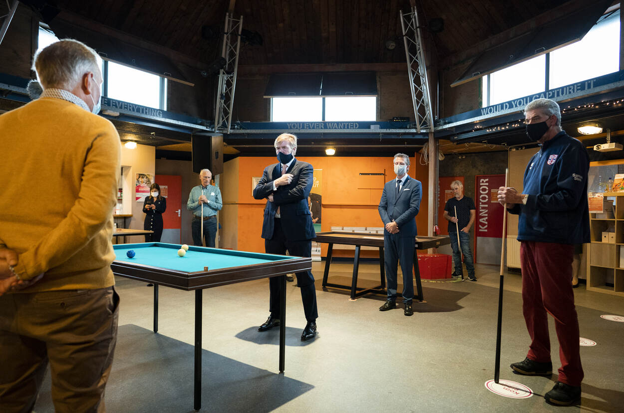 Koning Willem-Alexander bezoekt het initiatief Tijd voor Krijt, waarbij biljarten wordt ingezet als middel om ouderen met elkaar in contact te brengen.