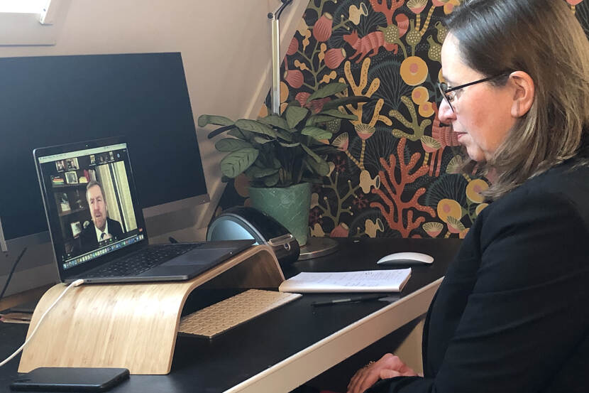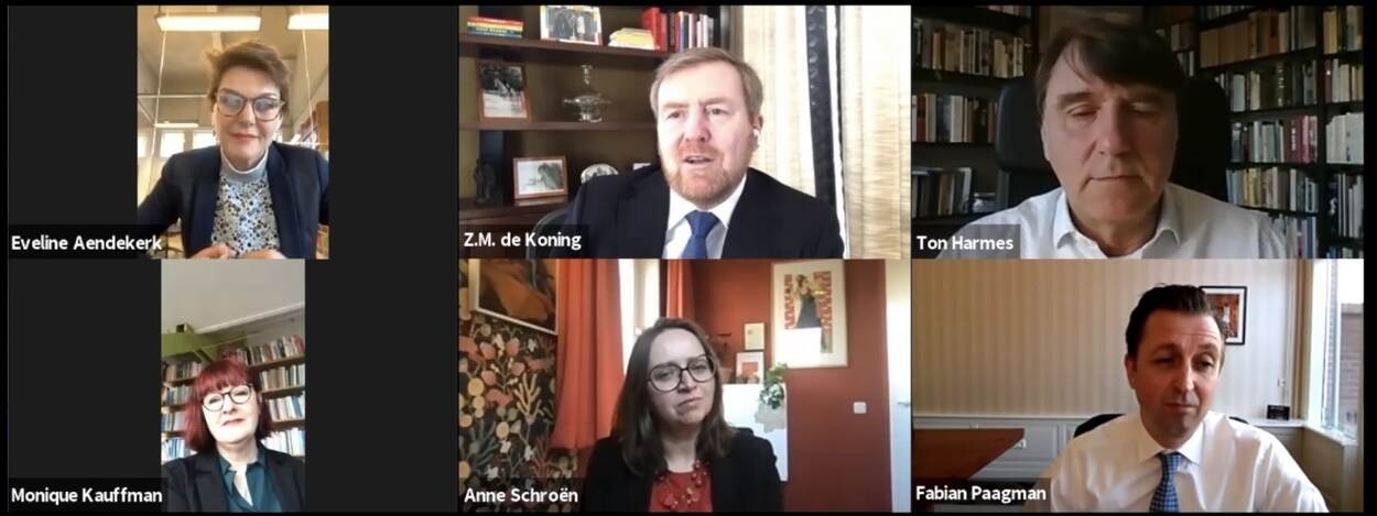 Koning Willem-Alexander voert een videogesprek met vertegenwoordigers van de boekverkopersbranche. Het gesprek stond in het teken van de gevolgen van de coronamaatregelen voor de sector, voornamelijk voor de boekenverkoop, de zelfstandige boekverkoper en de fysieke boekhandel.