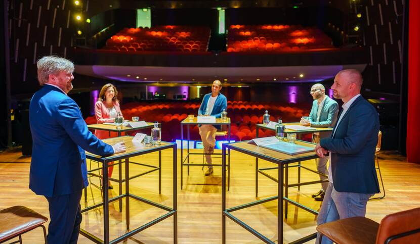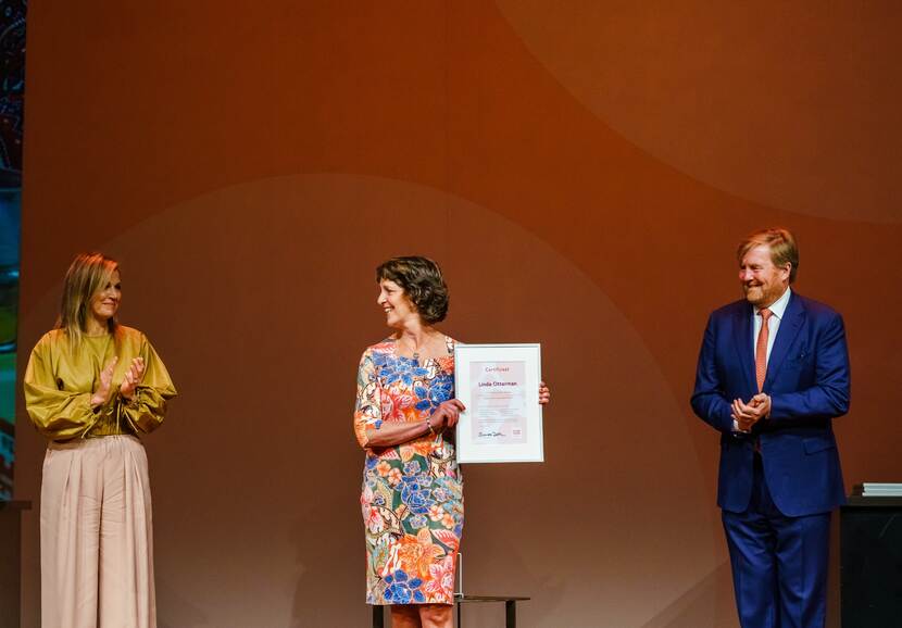 Koning Willem-Alexander en Koningin Máxima reiken in Hilversum de groeicertificaten uit aan de tweeëntwintig deelnemende organisaties van de vierde editie van het Oranje Fonds Groeiprogramma.