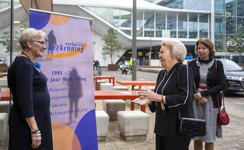 Prinses Beatrix is aanwezig bij het 40-jarig jubileum van Stichting Werkgroep Herkenning. Stichting Werkgroep Herkenning is een vrijwilligersorganisatie die in 1981 is opgericht en hulp biedt aan (klein)kinderen en familieleden van personen die in de jaren 1940-1945 aan de zijde van de bezetter stonden, dan wel de bezetter waren, en staat deze bij.