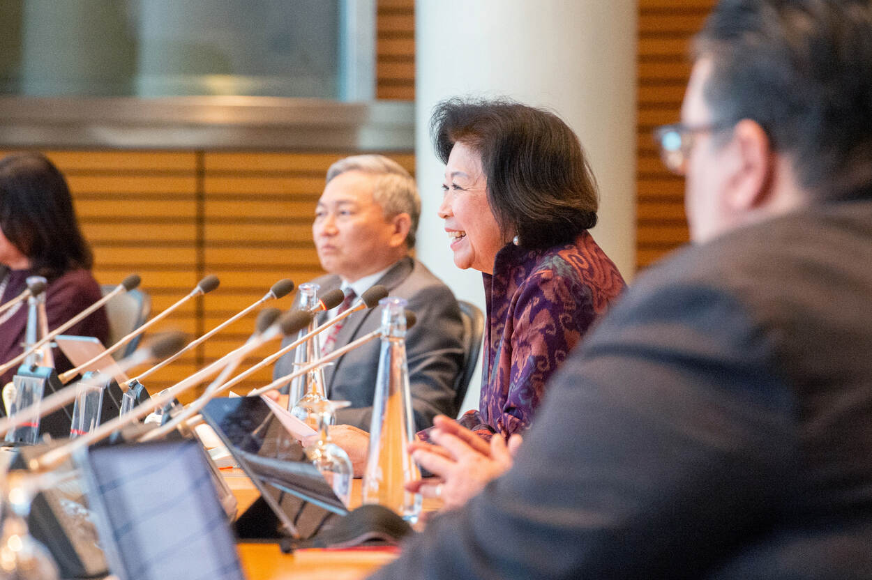 Vergroot afbeelding Koningin Máxima spreekt met Mari Pangestu