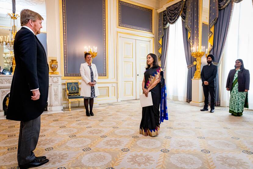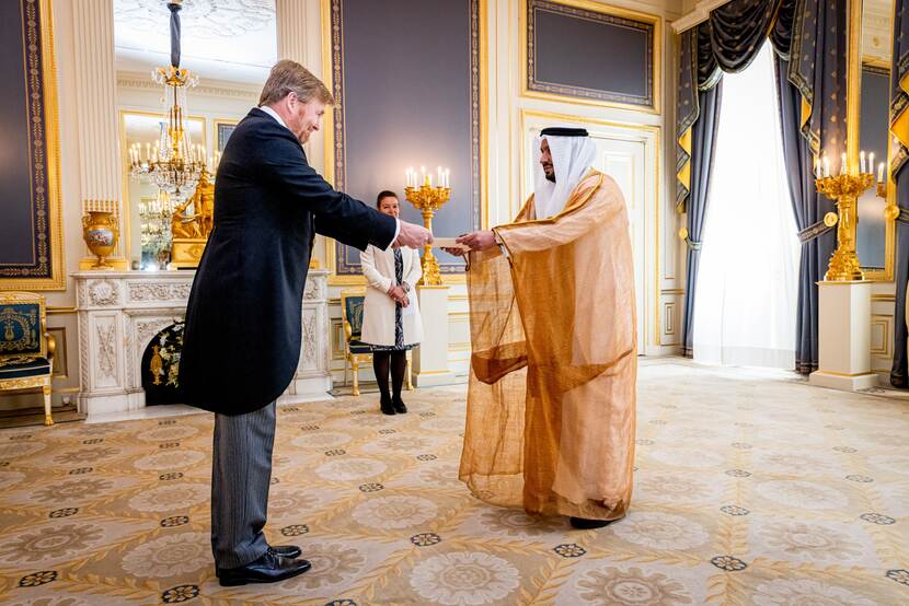 Koning Willem-Alexander ontvangt ter overhandiging van hun geloofsbrieven achtereenvolgens de ambassadeur van de Verenigde Arabische Emiraten, Z.E. Jama Ahmed Abdulla Almusharakh, en de ambassadeur van de Republiek India, H.E. Reenat Sandhu.