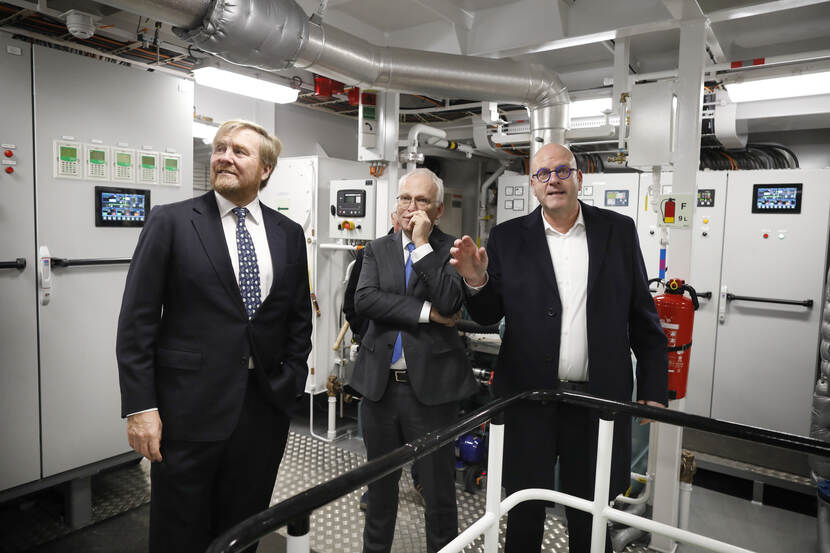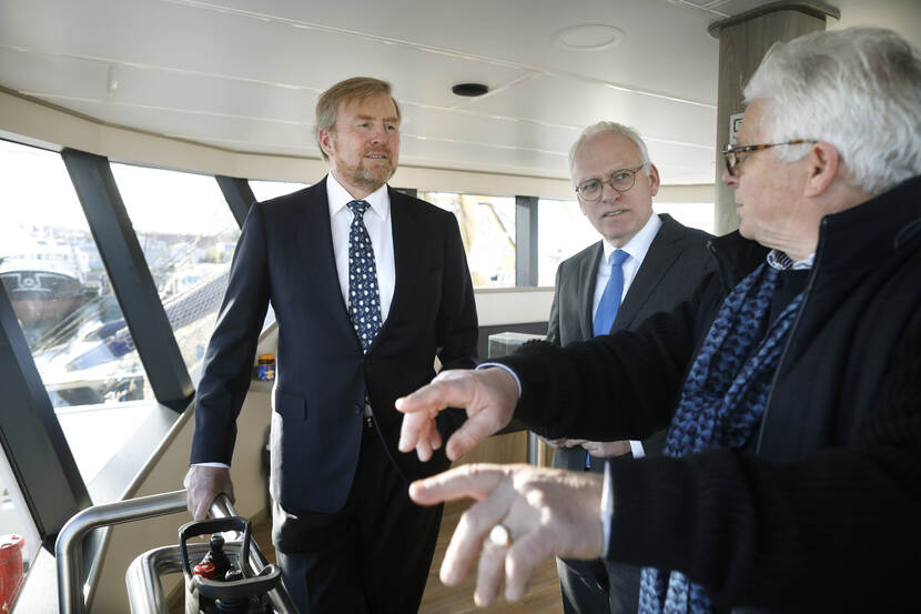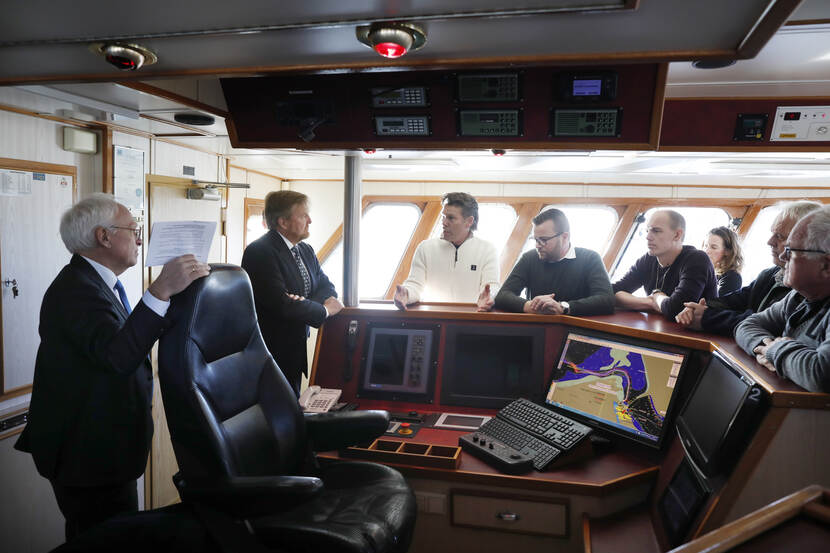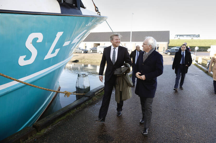 Koning Willem-Alexander en minister Piet Adema van Landbouw, Natuur en Voedselkwaliteit brengen een werkbezoek aan de binnenhaven en de visafslag van Stellendam.