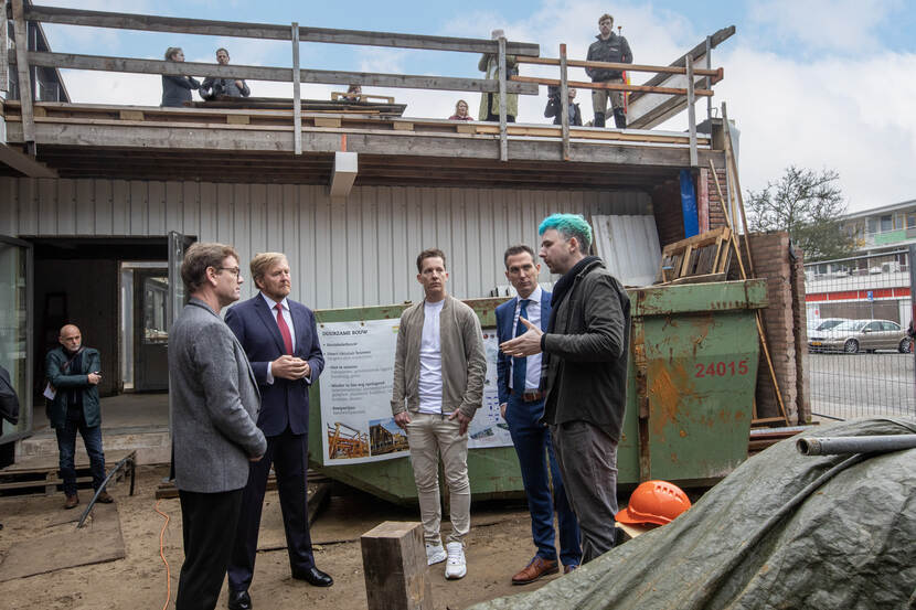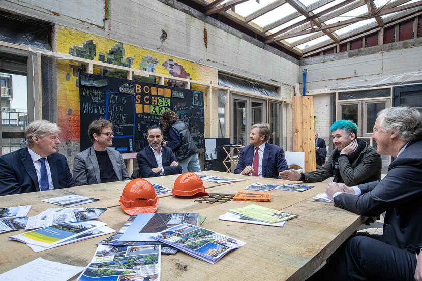 Koning Willem-Alexander brengt een bezoek aan collectief woonproject Boschgaard, dat pioniert op het gebied van duurzaam bouwen en zelfwerkzaamheid.