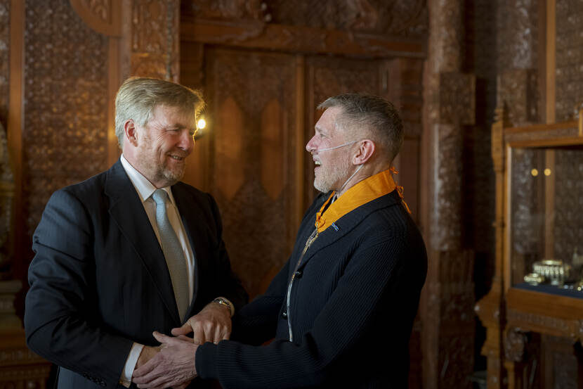 De Koning reikt de eremedaille uit aan Erwin Olaf. De fotograaf heeft verschillende portretten gemaakt van de Koning, Koningin Máxima en hun dochters.