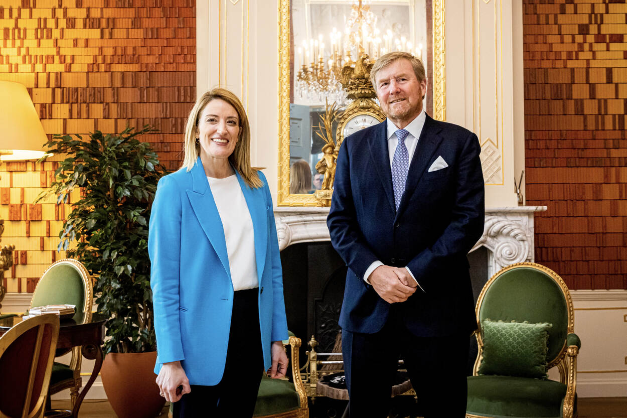 Koning Willem-Alexander ontvangt de voorzitter van het Europees Parlement, mevrouw Roberta Metsola, in audiëntie.