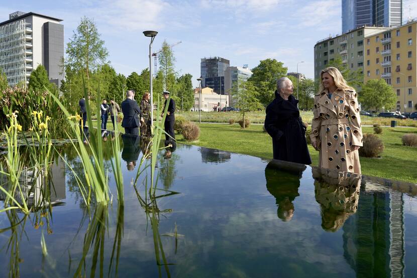 Koningin Máxima krijgt een rondleiding door een vernieuwend stadspark in de wijk Isola. Het park is vormgegeven door de Nederlandse landschapsarchitect Petra Blaisse.
