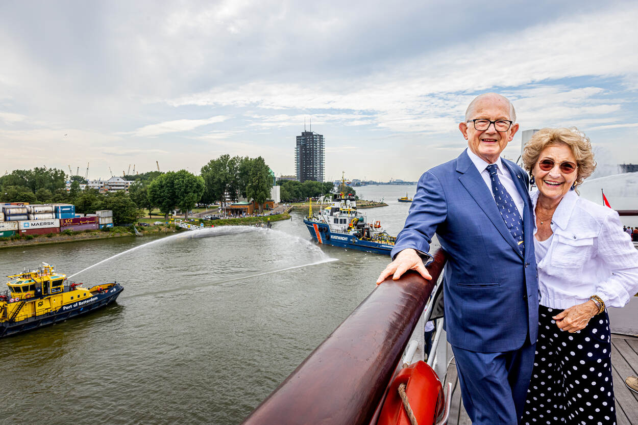 Prinses Margriet en prof. mr. Pieter van Vollenhoven wonen aan boord van ss Rotterdam de nautische demonstratiedag bij van het World Maritime Rescue Congress 2023.