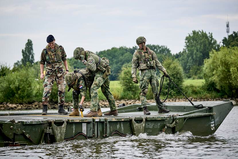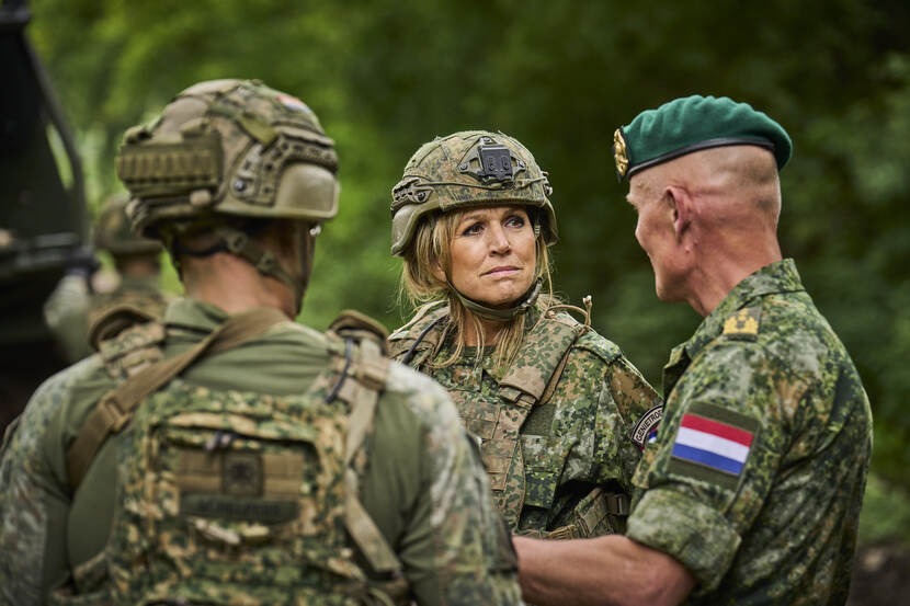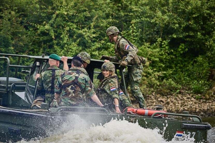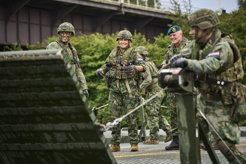 Koningin Máxima brengt een bezoek aan het Regiment Genietroepen. Dit specifieke krijgsmachtonderdeel is getraind in het vrijmaken van hindernissen en het bouwen van militaire infrastructuur zoals bruggen en veren.